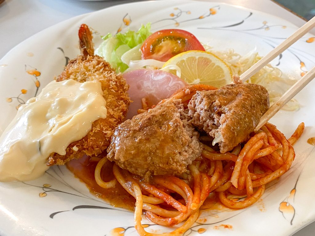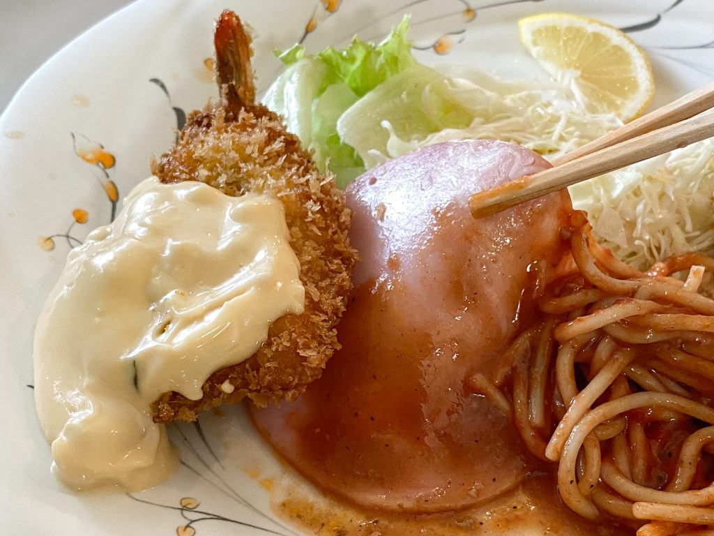 こちらはハンバーグとエビフライ、敷き詰められたパスタにサラダといろどり満点なワンプレートです。