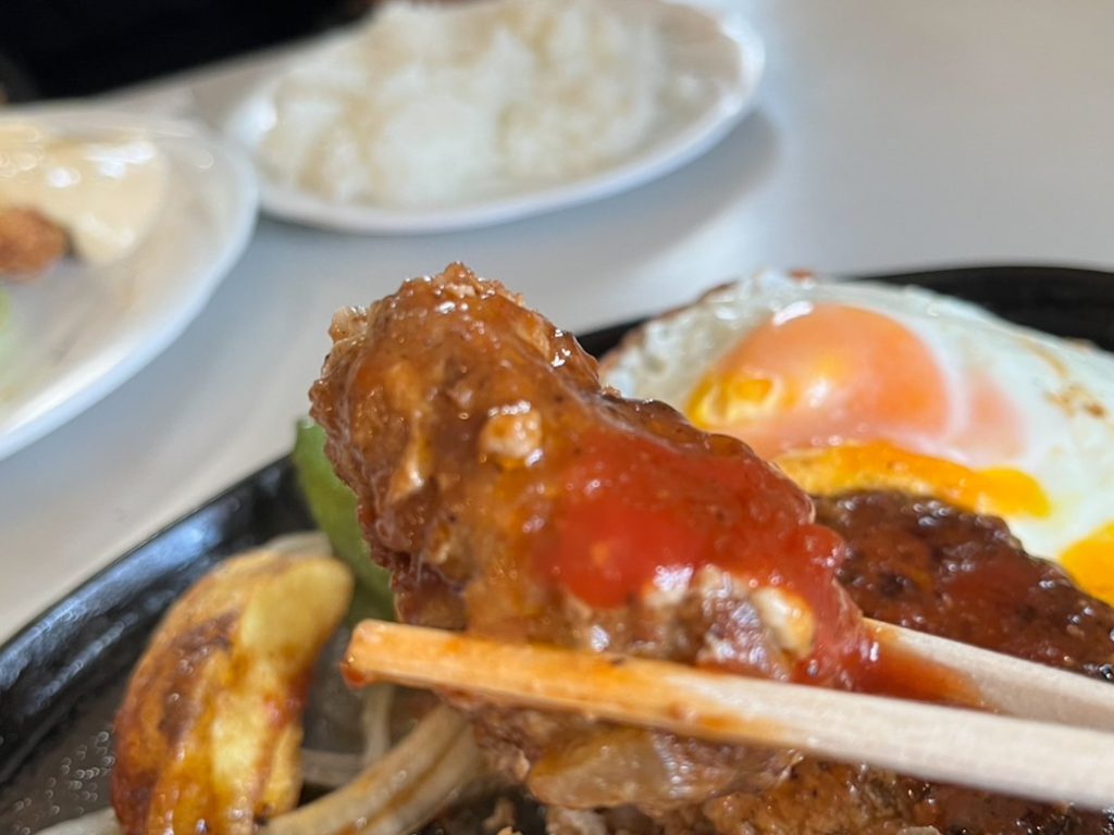 注文してから肉ダネを成形し焼き、ふわふわジューシーなので箸がスッと入ります。
