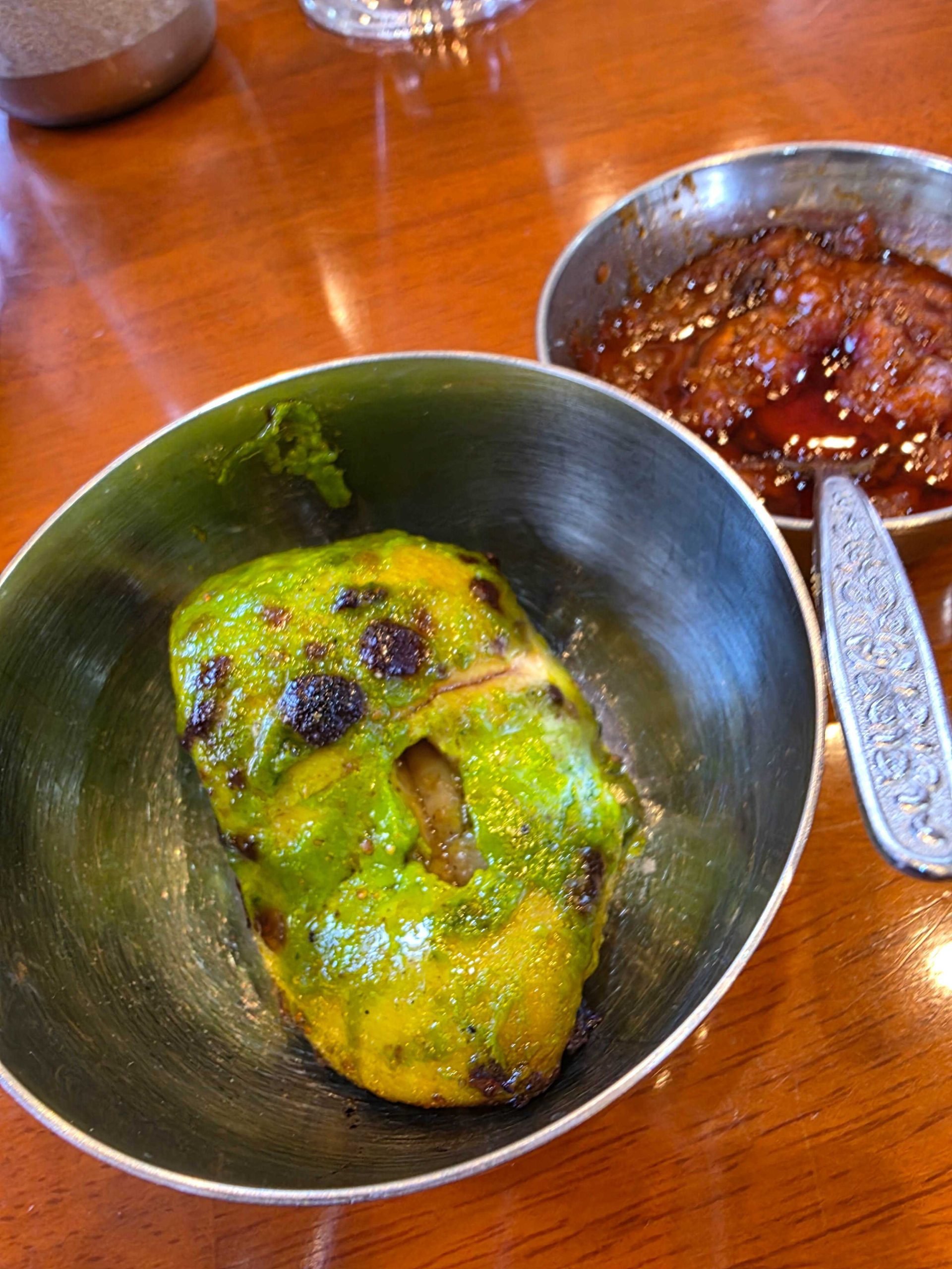 レディースセットにはバターチキンカレー、ほうれん草のカレー、サフランライス、サラダ、ドリンクとなんとデザートまで付いていてナン(プレーンかハニーが選べます)は食べ放題! 右がグリーンティッカのチキンです。