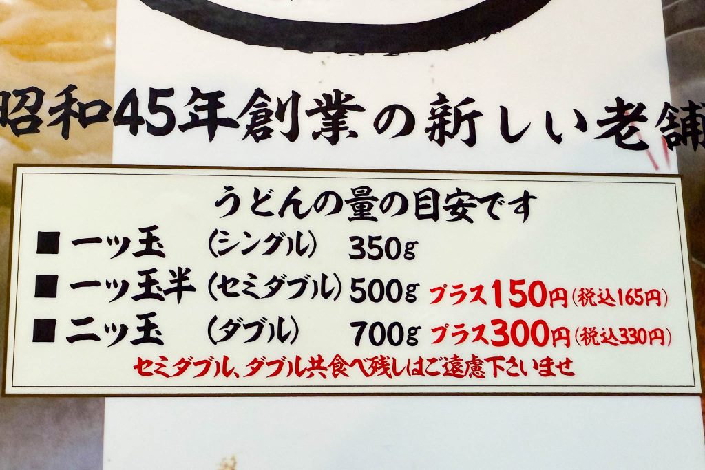 通常のうどんは一人前180g〜250gですが、釜盛のうどんはシングルでも350g!!