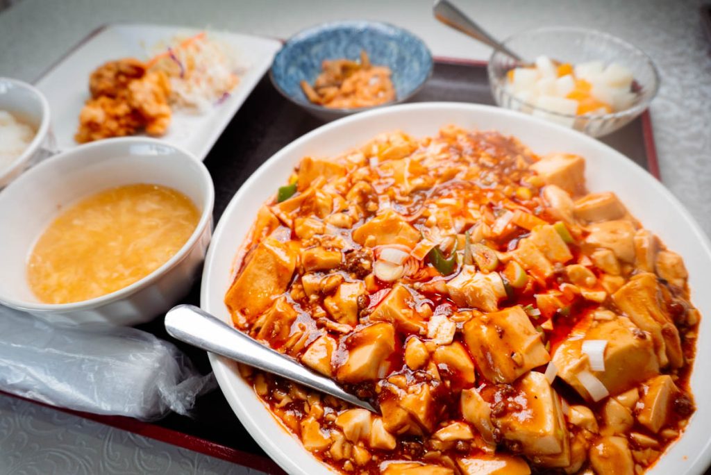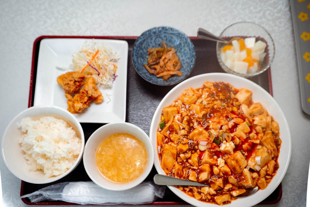 麻婆豆腐以外にもスープや唐揚げ、デザートもセット。880円とは思えないボリューム!