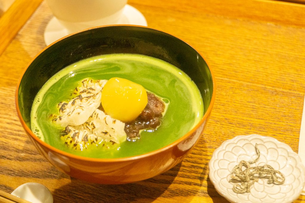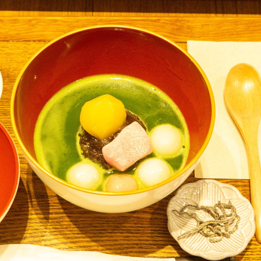 白玉抹茶ぜんざいはとろみのあるお抹茶にモチモチな白玉が合います!
