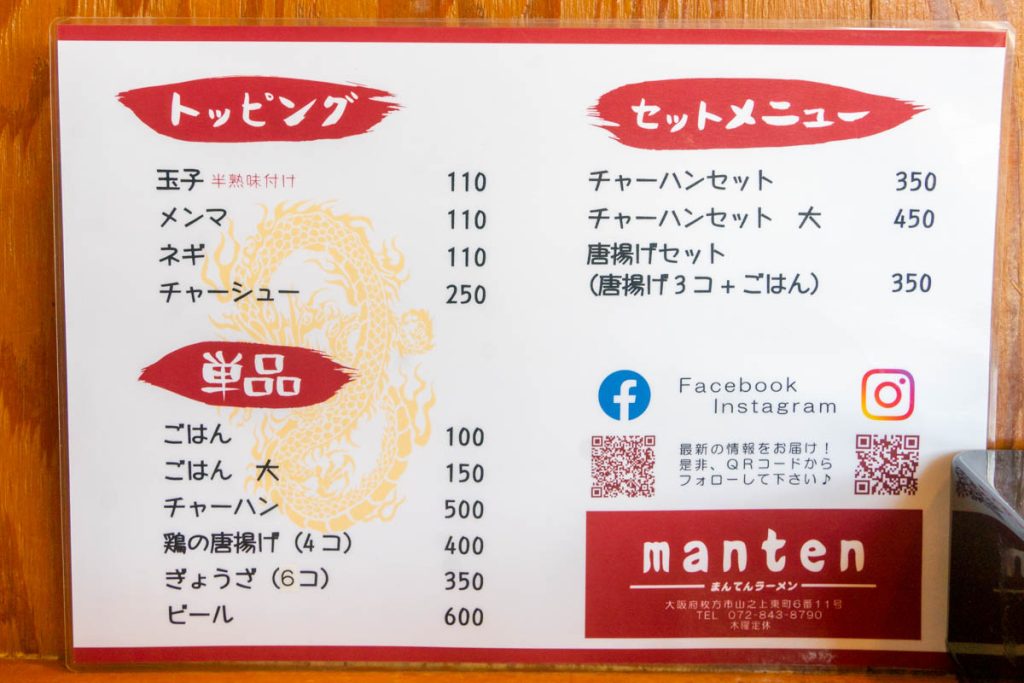 まんてん 営業時間 11:30-14:30 / 18:00-22:00(L.O.21:40) 定休日 木曜日 住所 大阪府枚方市山之上東町6-11 駐車場 有 関連リンク ※店舗情報、記事内に掲載している商品、価格等は取材時点のものです。