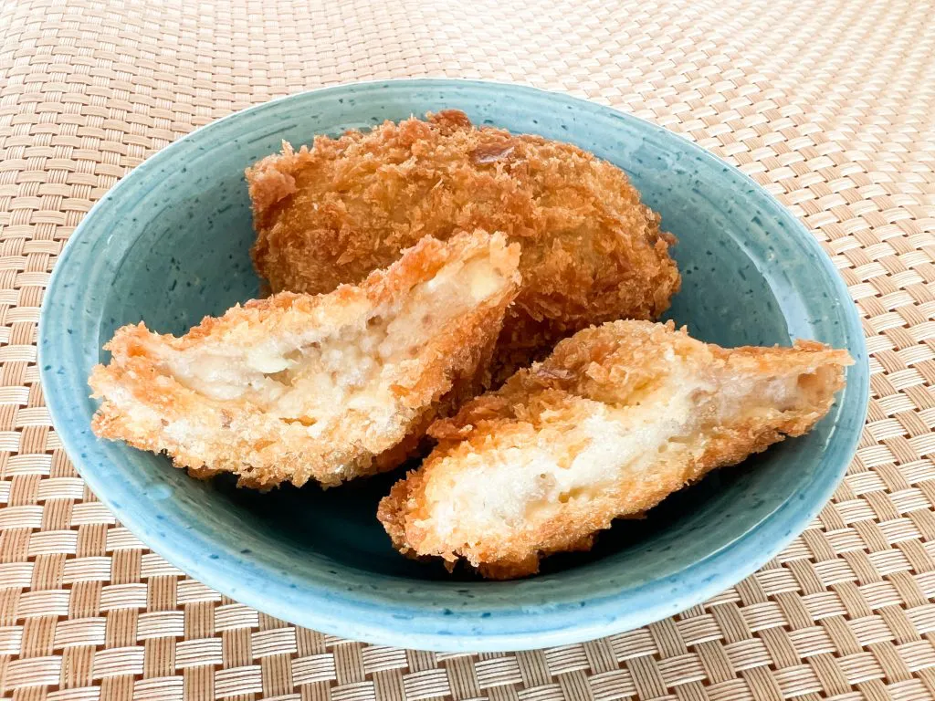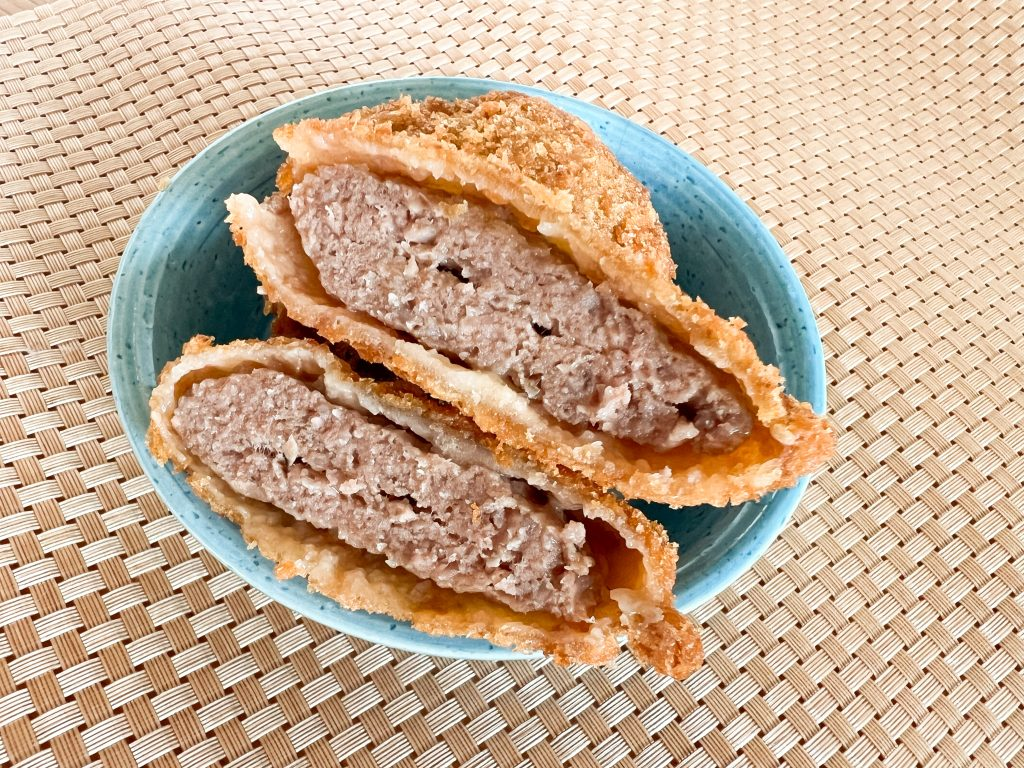コロッケ作るって自分的にハードルが高く、人生で1回ぐらいしか作ったことがないんです。大好きですが。それが1つ100円で頂けるってやっぱり嬉しい!じゃがいもの甘みたっぷり!