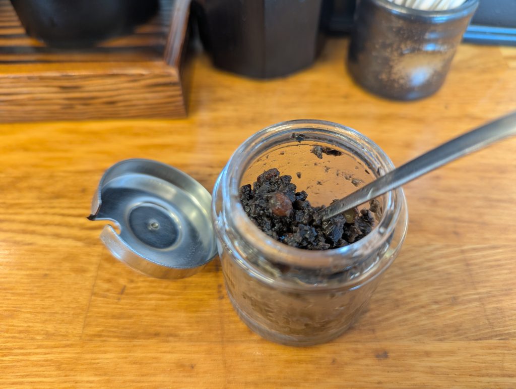卓上には山椒のタプナード(オリーブオイルなどと混ぜてすり潰したもの)があり味変できます。