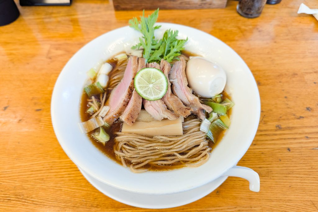 普通の鴨出汁そばとの違いは、チャーシュー3枚、煮卵、メンマ増量!