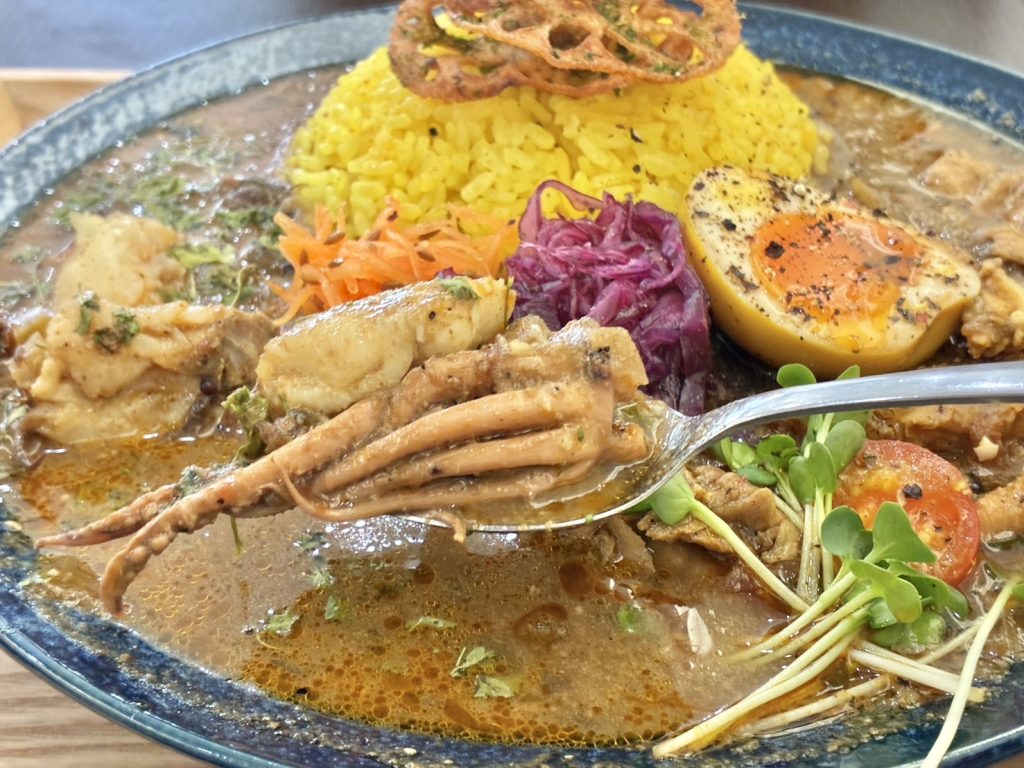 奥が国産若鶏ハラミとやげんなんこつの鶏ガラ出汁カレー。ぷりっと鶏肉にコリコリ軟骨、出汁とスパイスの香り、食感も楽しめるスパイスカレー!