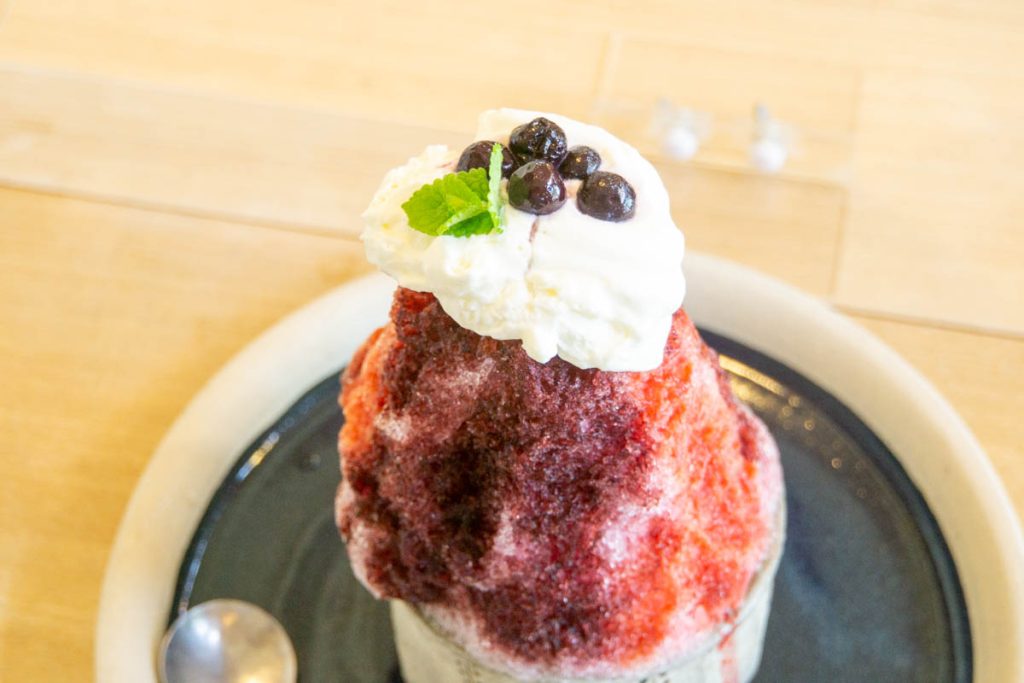 ふわふわな氷にはブルーベリーソースとフランボワーズソースの2種類のシロップがかかっています。
