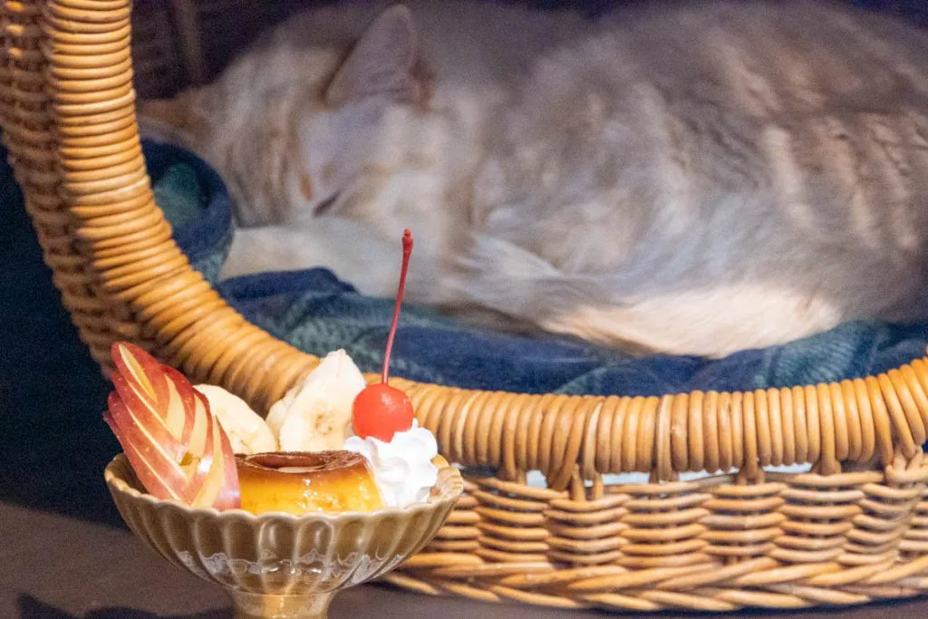 「プリンアラモード」と猫さん。映えでしかないです。