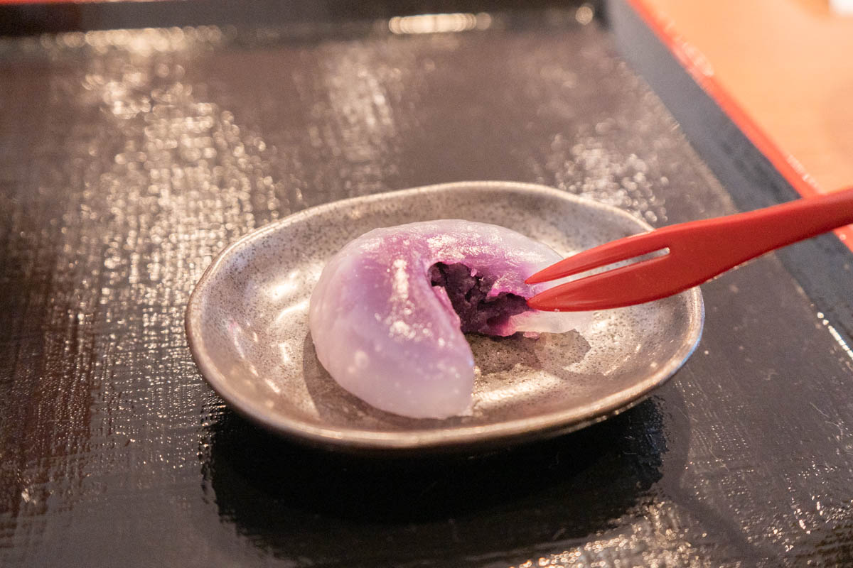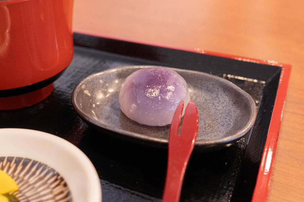 最後のしめには、セットになっているデザート。この日は紫芋の水まんじゅうでした。スタッフさんによるとこちらのデザートは季節により変更になるそうです。ぷるぷるで美味しかった〜!