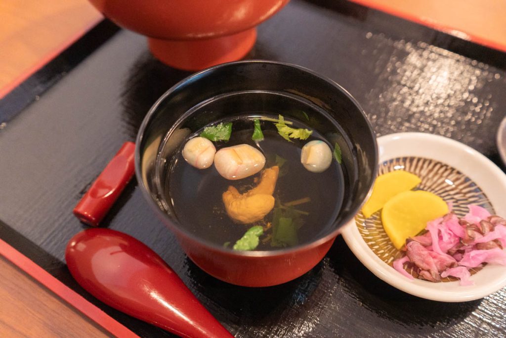肝吸い。お出汁のきいた上品な味です。肝吸いならではのほろ苦さがアクセントになって美味しい。