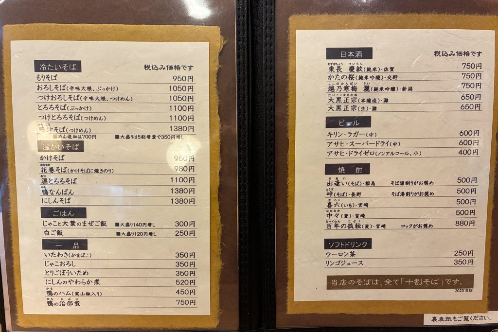 悩みに悩みましたが、我が家は鴨なんばん(1380円)と、もりそば(950円)の大盛り(350円)をチョイス!