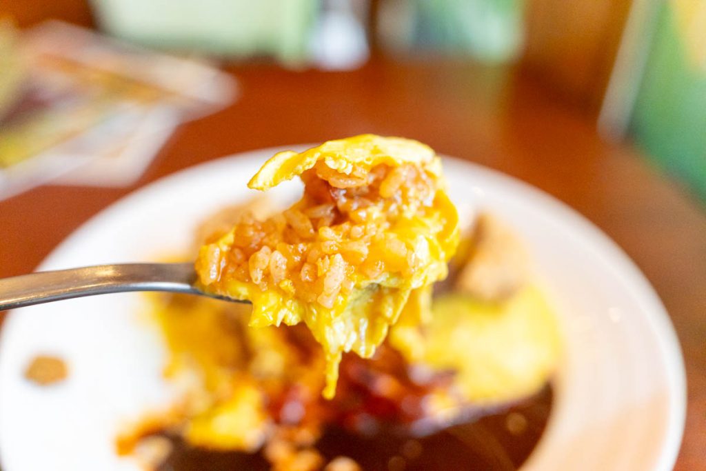 とろとろのたまごにライス。そこにデミグラスソースが加わって濃厚。個人的にはたまごがやっぱり違うなと!「しんたまご」というたまごを使っているそうですが、それもあると思うんですが、とろとろにする腕的な。