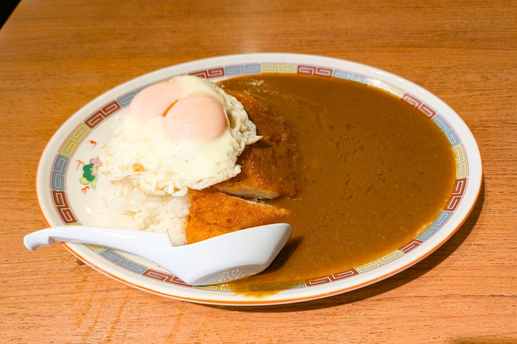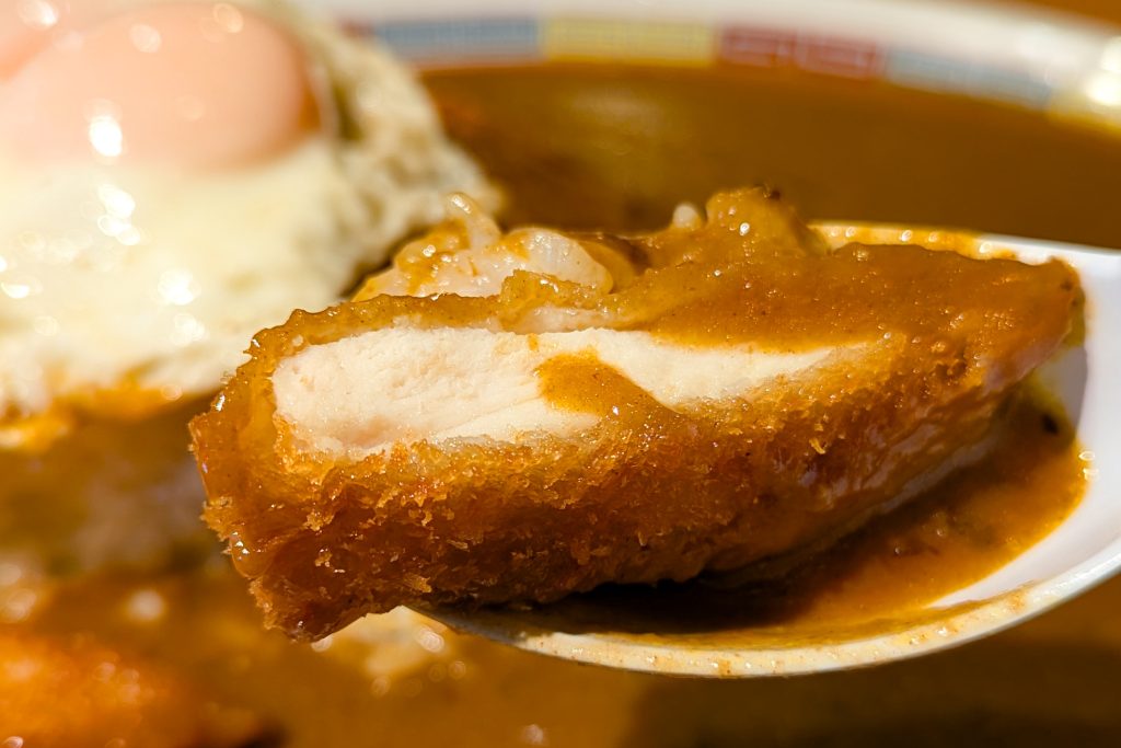 大きめの皿にたっぶりのルー、そしてカリッカリのチキンカツと目玉焼きが添えられており見るからに美味しそう。
