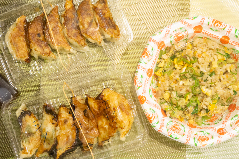 左下が海鮮トリオ餃子で、その上が肉餃子(291円)、そして右がネギチャーハン(745円)です。