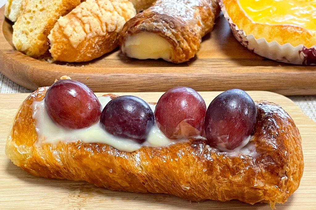 とってもジューシー!ぶどうのフレッシュ感とデニッシュのしっとり感を、間に入ったクリームがほどよくつないでくれていて、美味しさが口いっぱいに広がります。