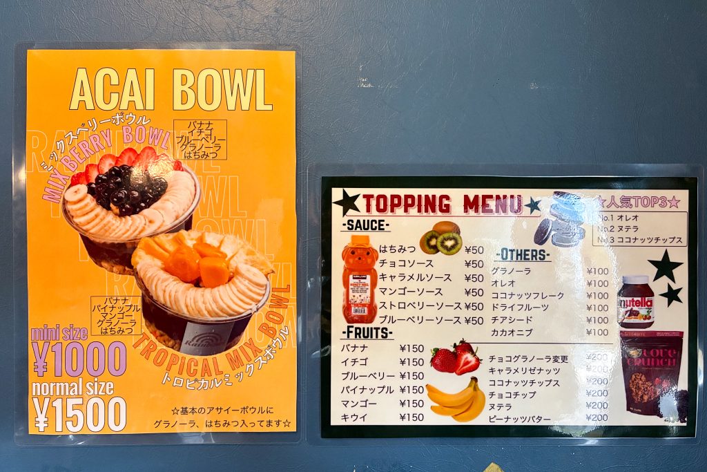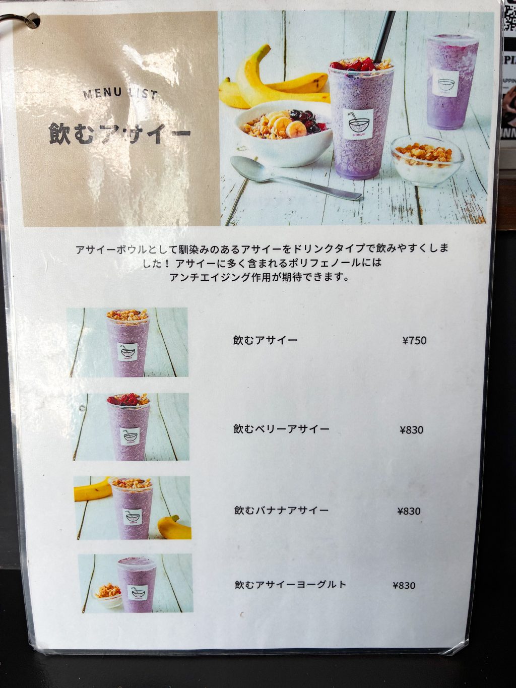 アサイーボウルの種類は2種類でそこから好きなトッピングをしていくスタイル。