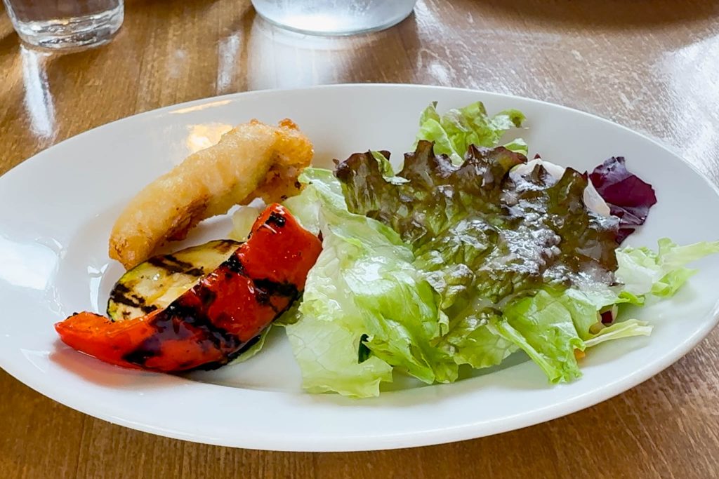 焼き野菜も香ばしいし、揚げ物は白身魚のフリットだと思いますが、ちょうど良く食べやすい温かさ。