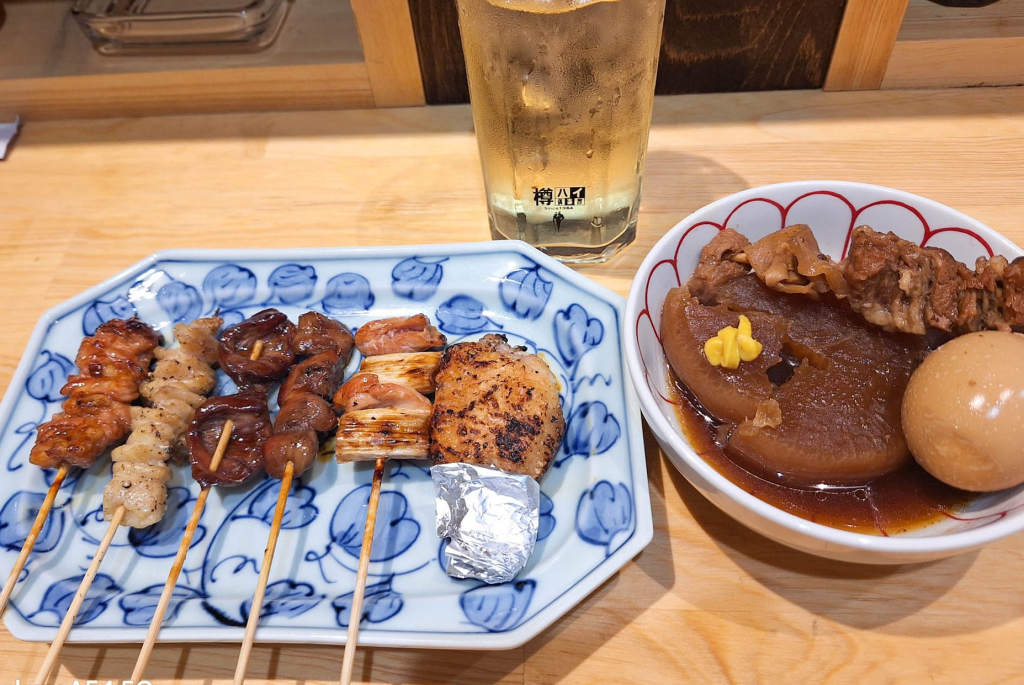左からもも、鶏皮(塩)、こころ、肝、ねぎま、手羽先です。鶏皮はとってもジューシーで塩味とよく合っていてうまい!