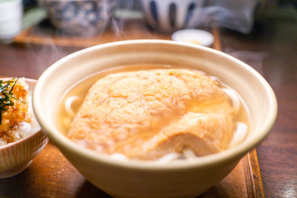 「きつねうどん(900円)」とミニ丼セット「とり天のっけご飯(+280円)」です!