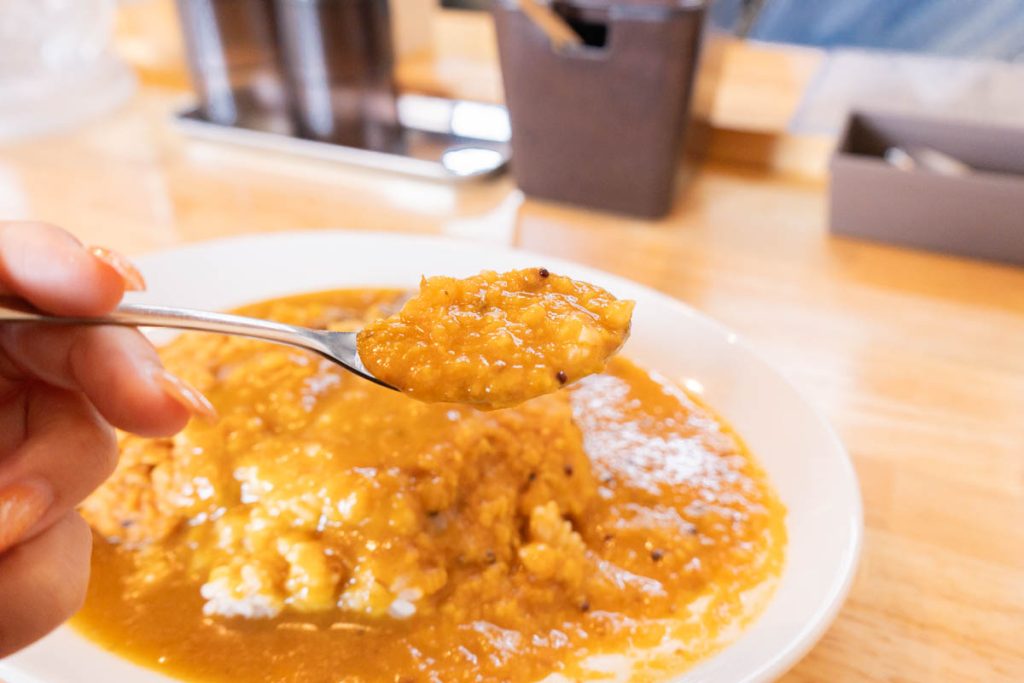 ではまず、一番右が「ダルカレー」。ダルカレーはインドをはじめとする南アジアでよく食べられている豆を主原料としたカレーで、インドの味噌汁と例えられるほど、インドでは馴染みのある料理なんだとか。
