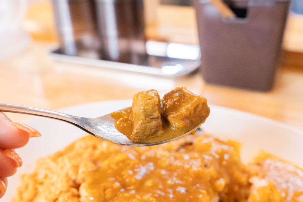 大きいお肉がゴロゴロ入っています。ほろっとほどける美味しいお肉。スパイシーの中に野菜の甘みも感じられるルー!流石です。