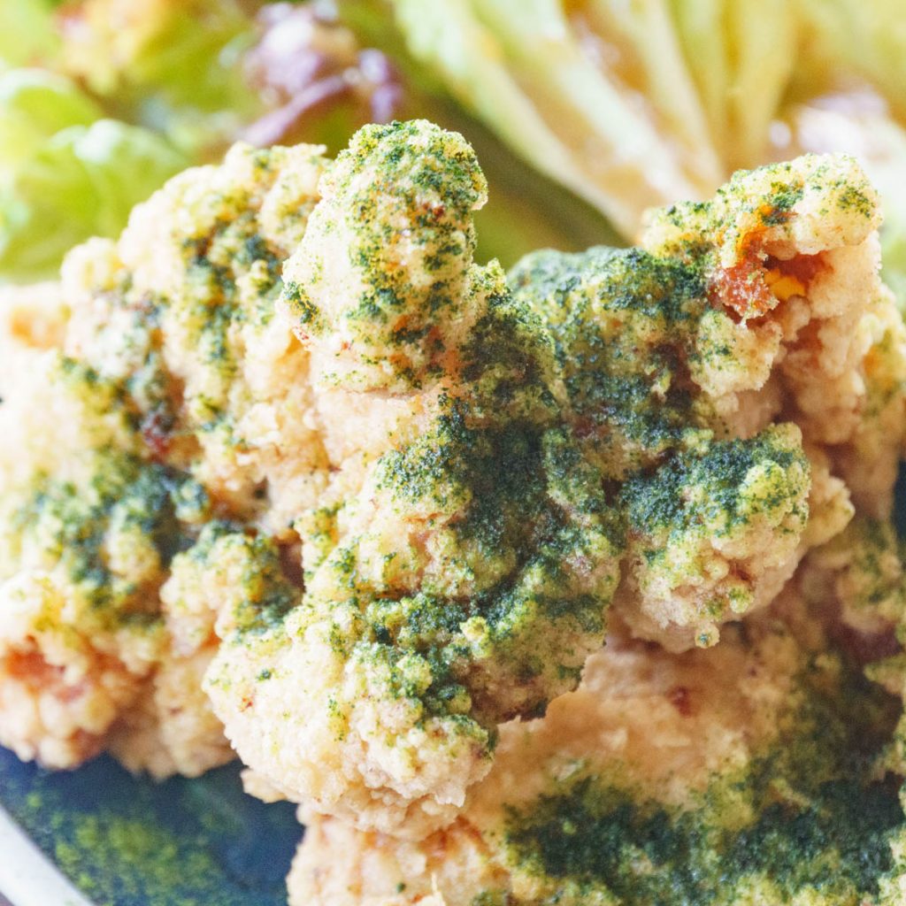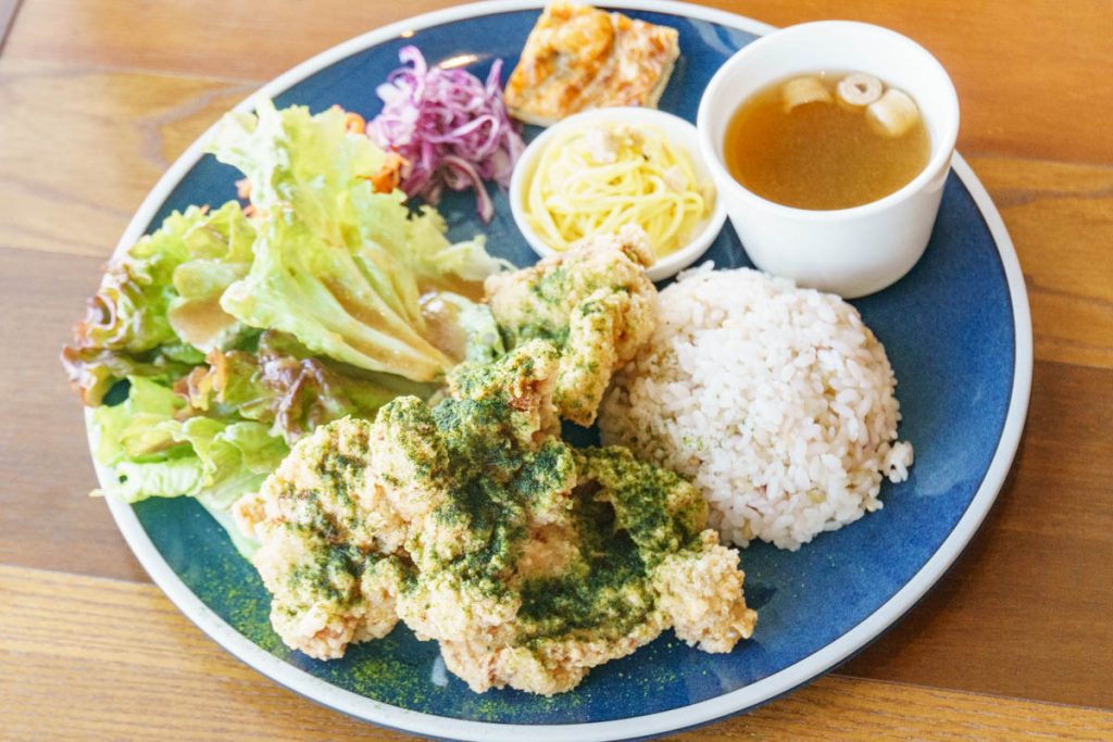 唐揚げランチ。唐揚げの上にかかっている緑のやつは抹茶塩です。