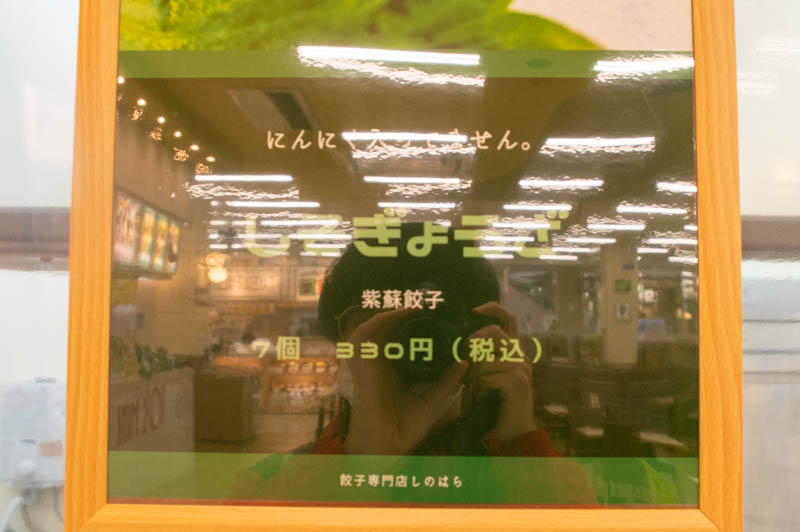 こちらは「しそ餃子1人前」(330円)。緑色なのもいい!後ろに写っているのは通常の餃子(300円)。