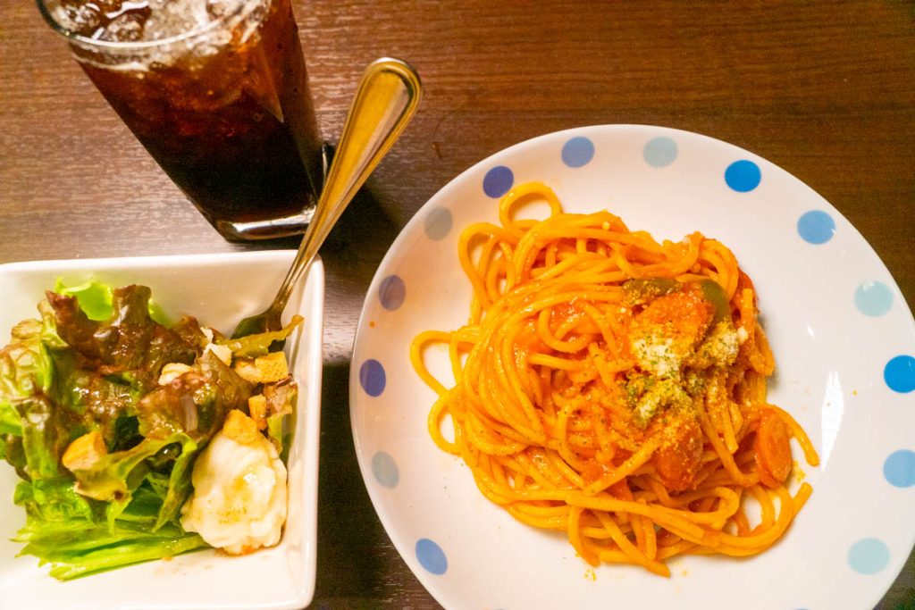 出てきた枚方ナポリタン。サラダとドリンクがセットです。
