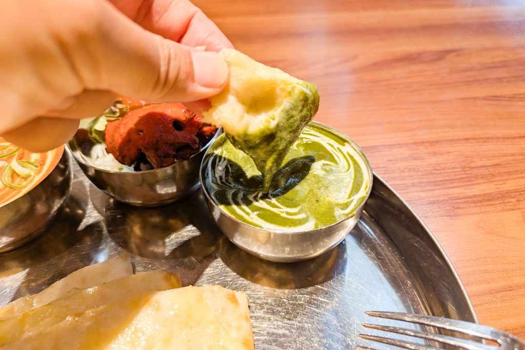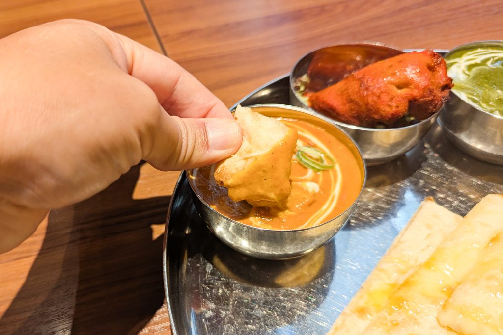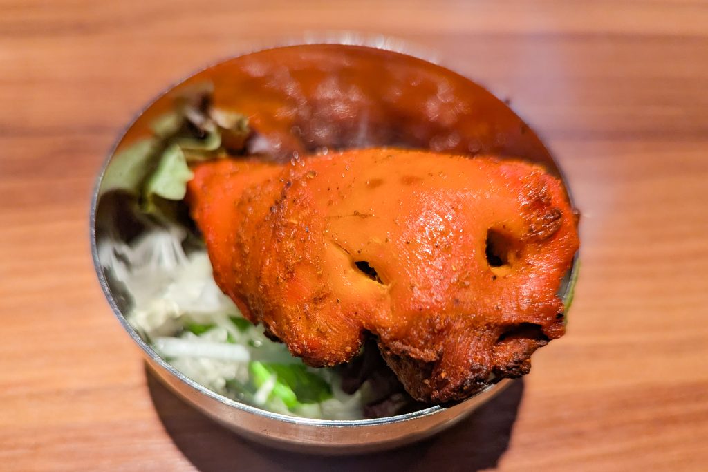 ランチにはチキンティッカもついていて、カレーの合間にスパイシーなチキンも楽しめます。