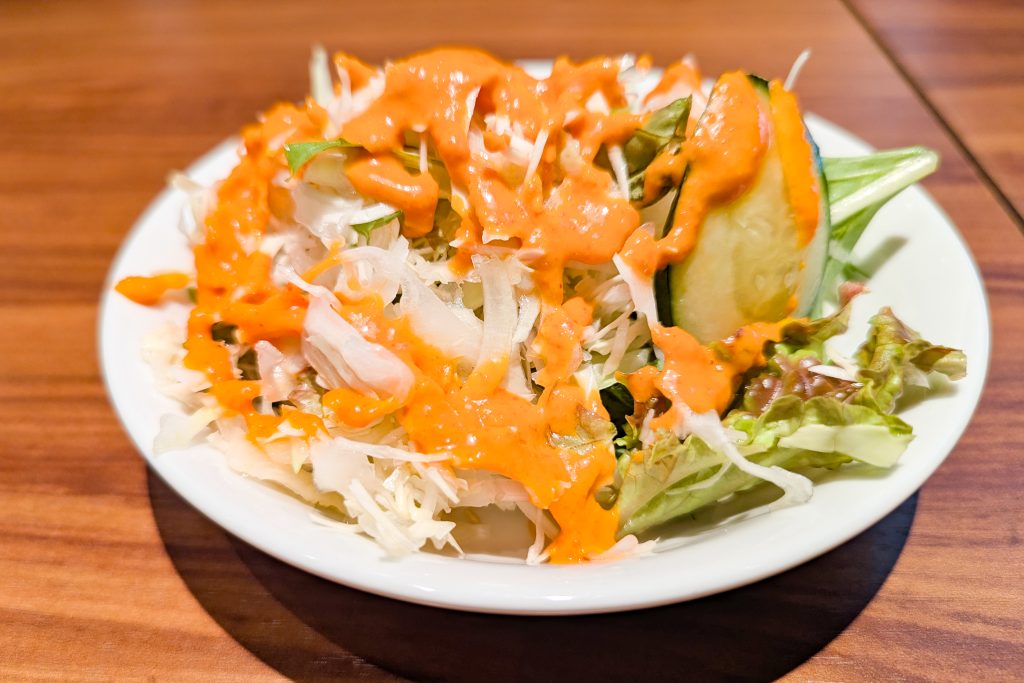 まずはインドカレー屋さんで絶対に出てくる謎のオレンジドレッシングのかかったサラダ。