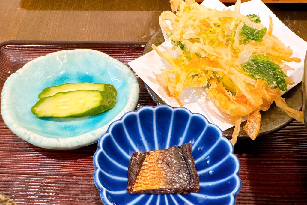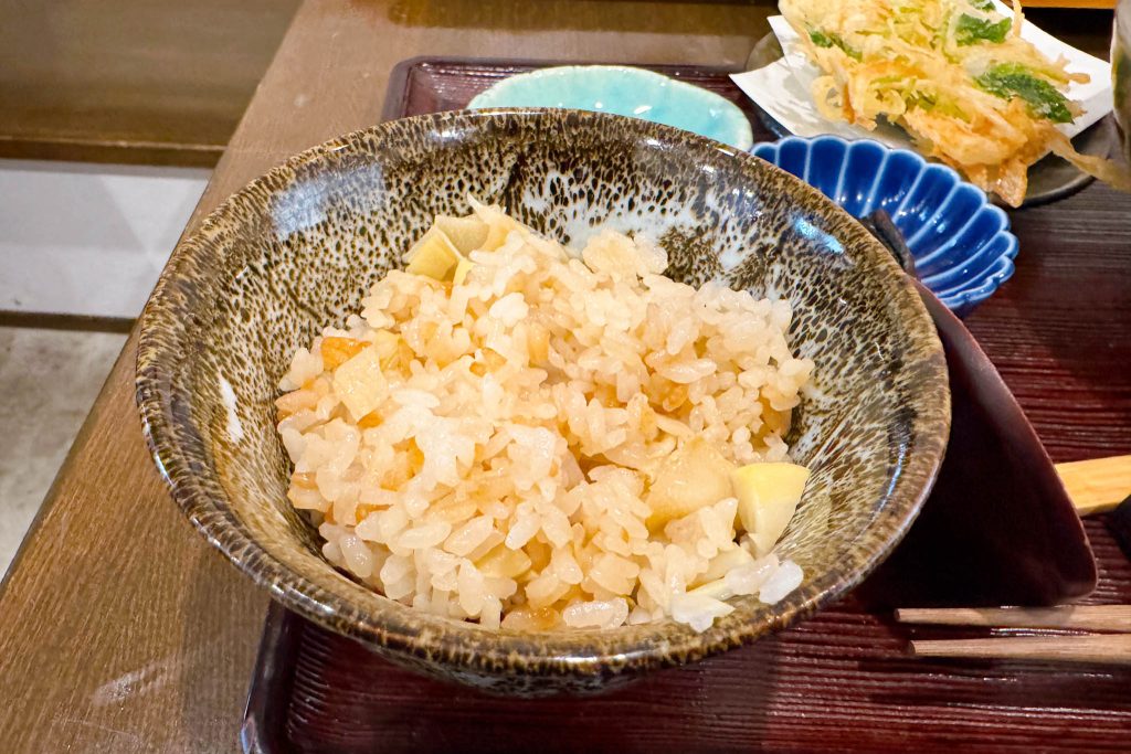 この時期のご飯は筍ご飯でした!こちらもサクサクのミニかき揚げにお新香に、小鉢のお魚が付いてます。