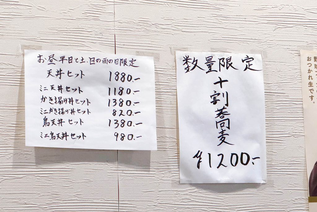 数量限定で十割蕎麦や、平日お昼と、雨の日限定のセットメニューもあるみたいです!