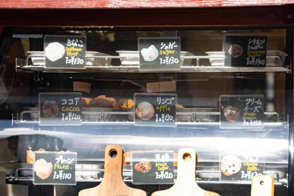 「サーターアンダギー プレーン(110円×3)シュガー(130円×3)シナモンシュガー(140円×3)きなこ(130円×3)」です!