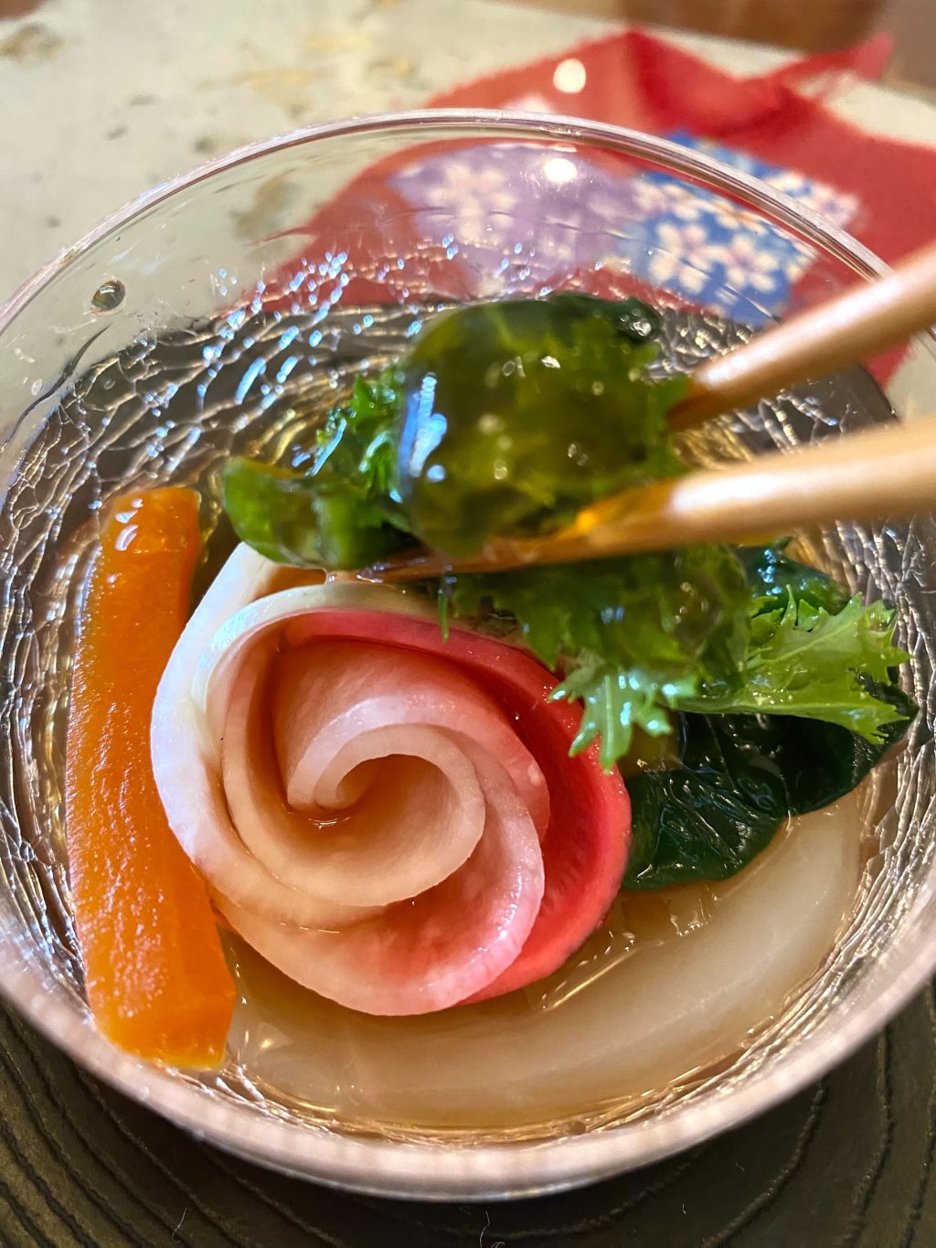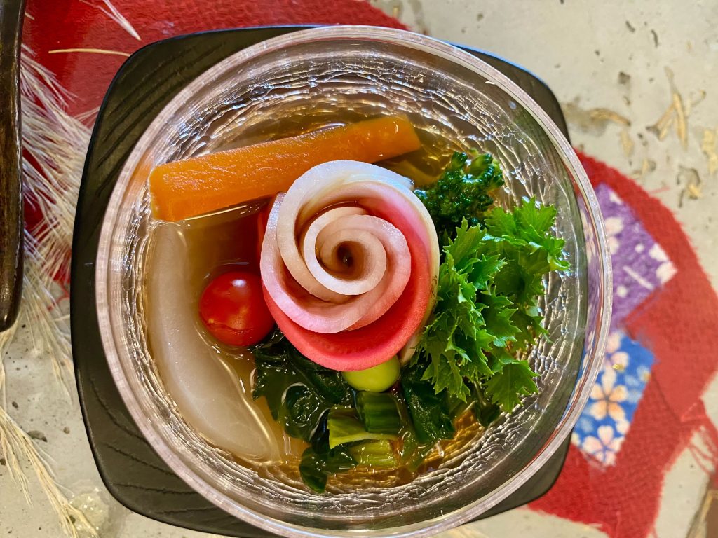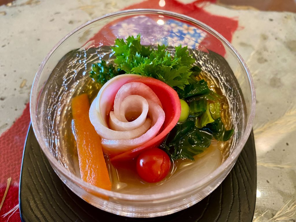 2品目は、「わぁ綺麗~!」とみんなで。枚方の穂谷のお野菜を使ったジュレ。一凛のバラに見立てた紅芯大根が美しい!可愛いマイクロトマトやわさび菜の緑との組み合わせが素敵でした。