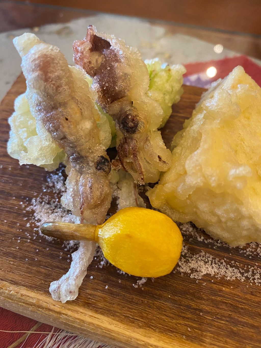 5品目は、天ぷらの盛り合わせ。つぼみな、穂谷産のさつまいもは超甘かった!ホタルイカの天ぷらが珍しい~ここにも春がっ!!!小さなクワイがメデターーーイ!!!