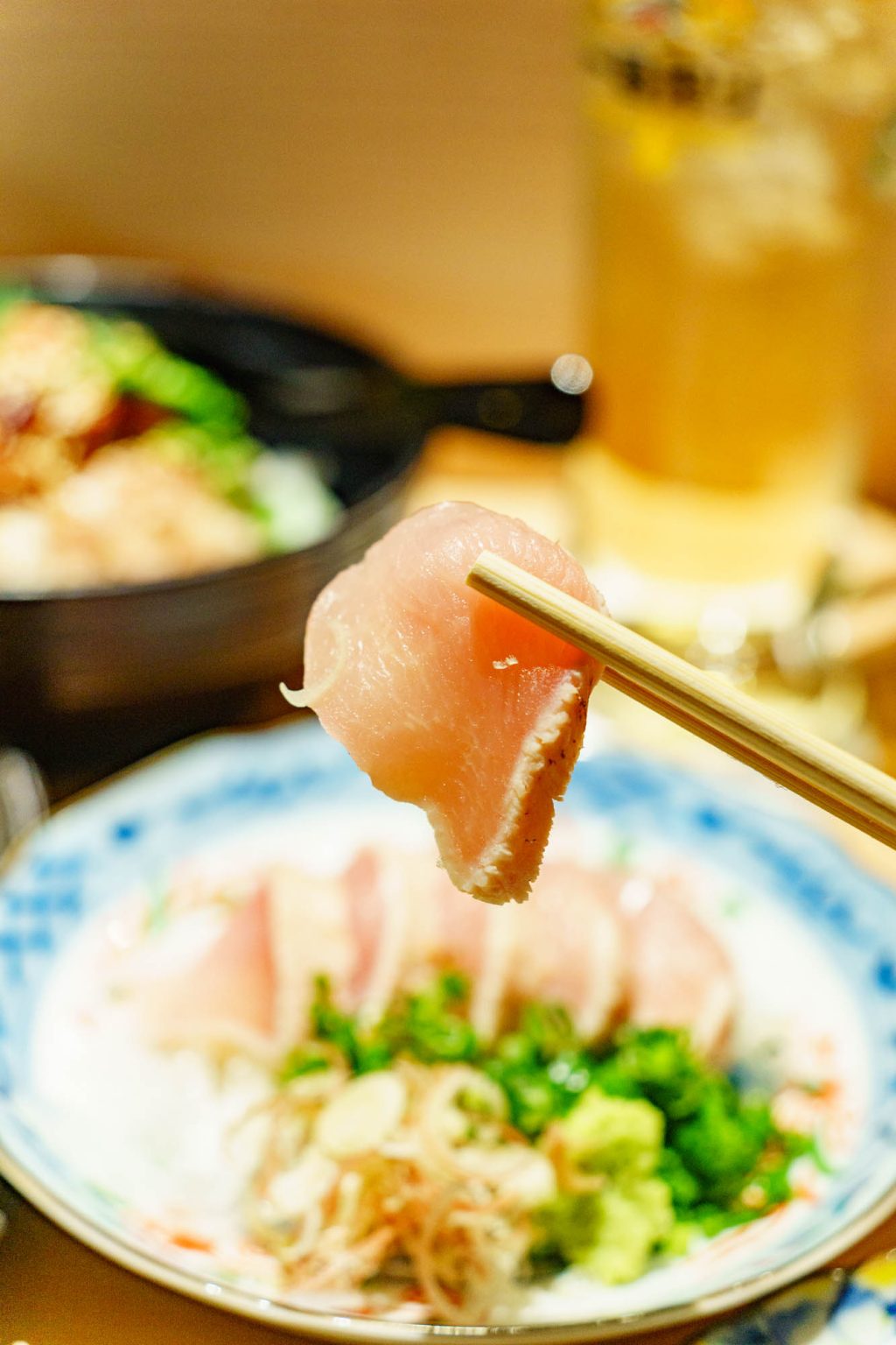 鶏むねたたき!鹿児島さつま知覧どりを使っているそう。薬味もたっぷりでいただきます。