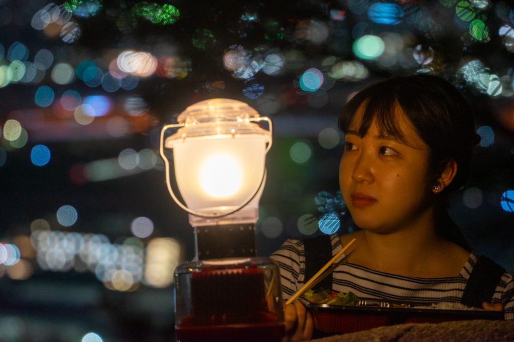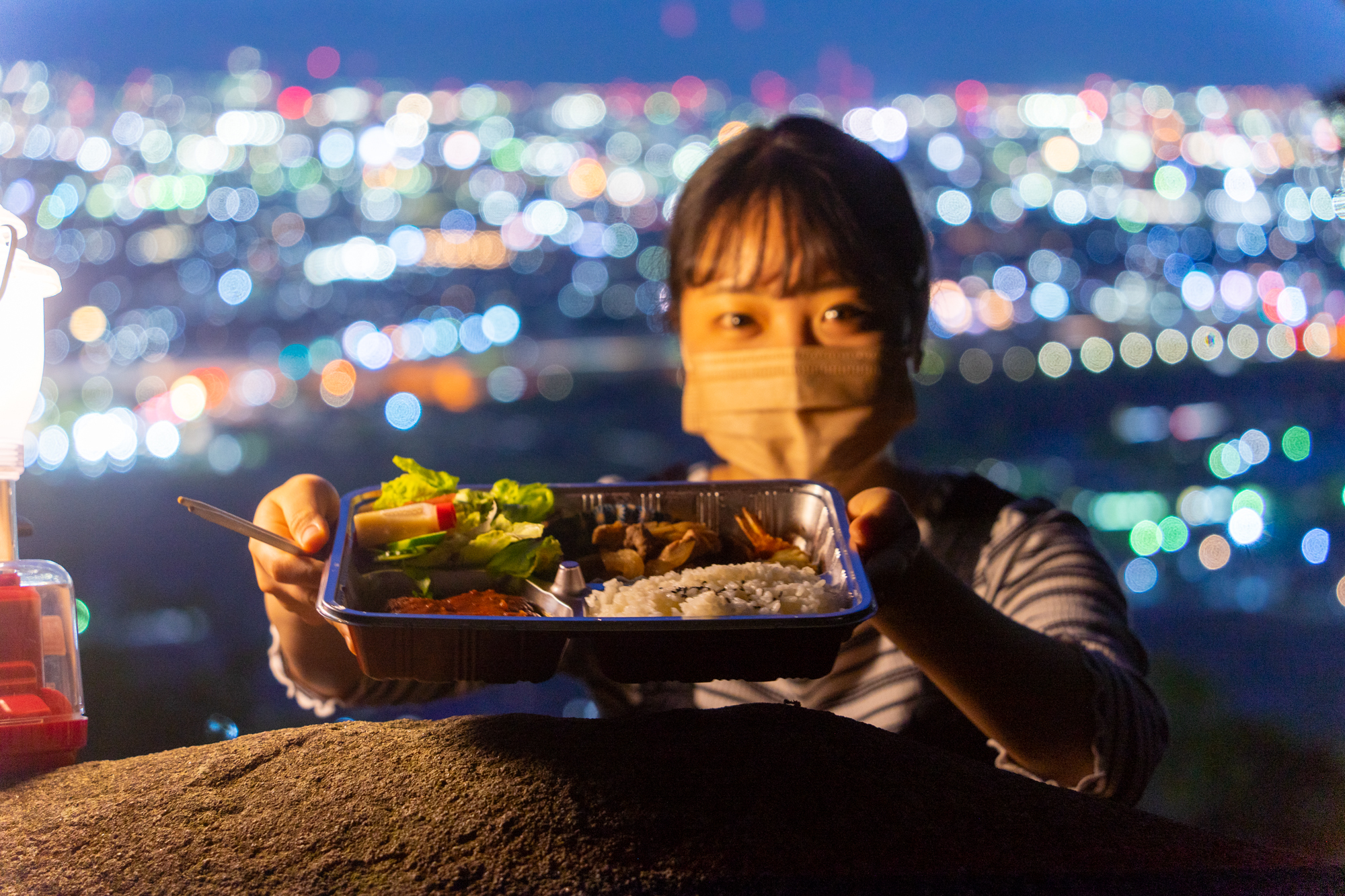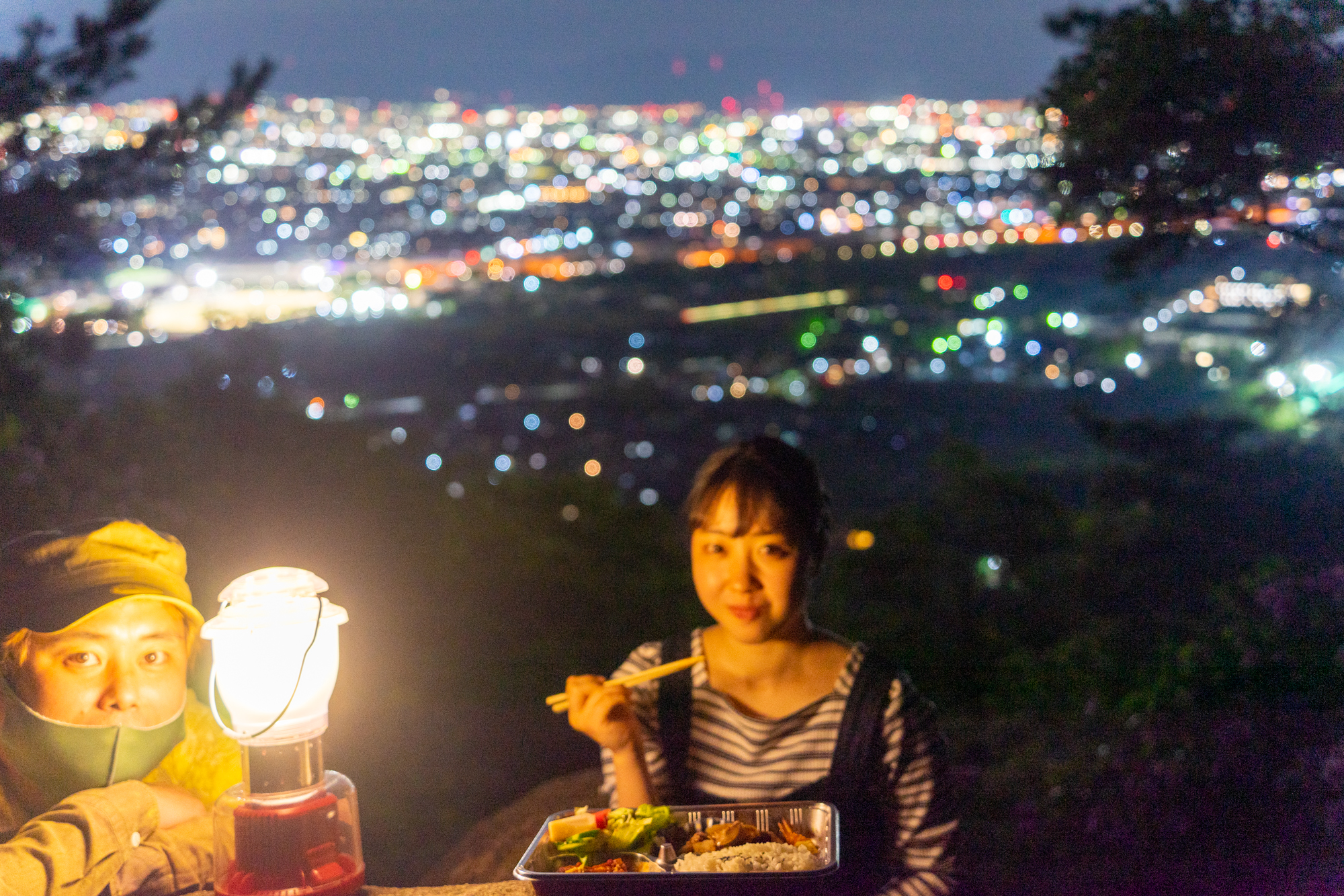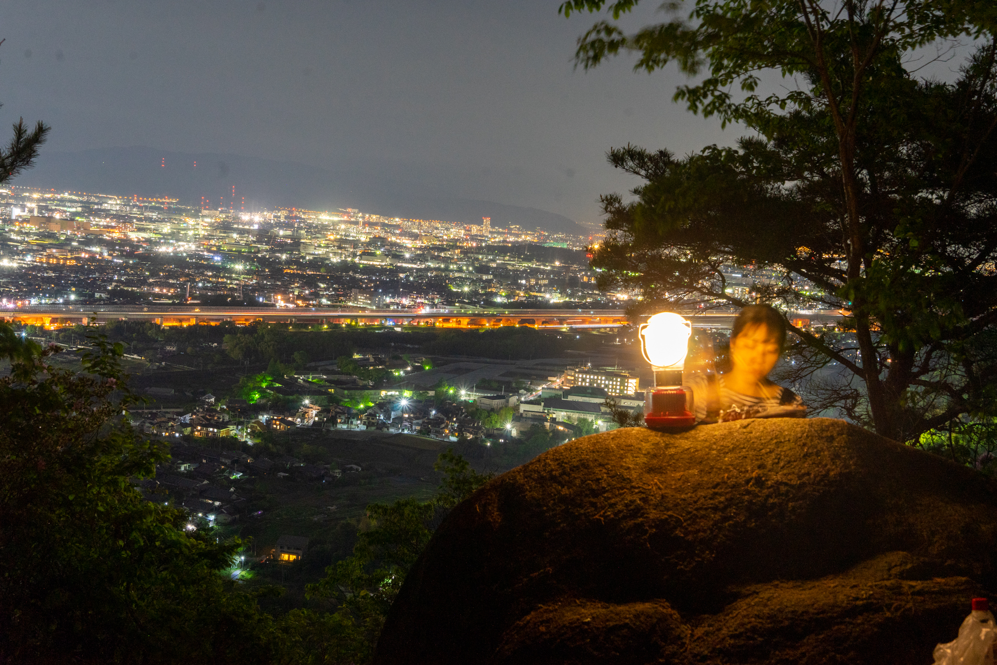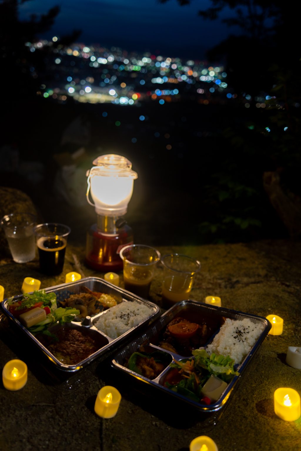 どこでピクニックすれば夜ピクニックっぽいのか、悩んだんですが夜景をバックに撮影すれば完璧のはず!ということで今回は交野市にある国見岩から、枚方の景色を見ながら食べることに。