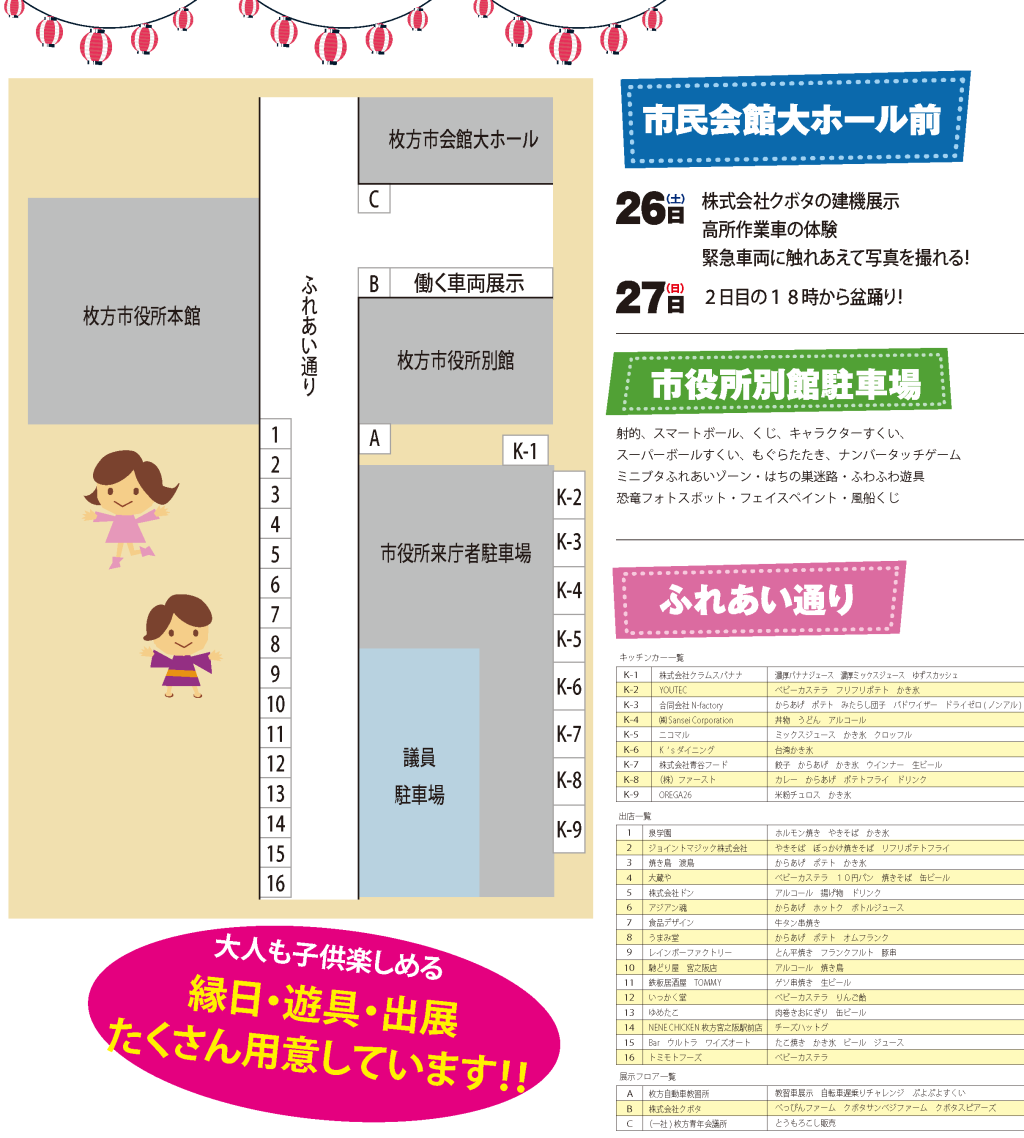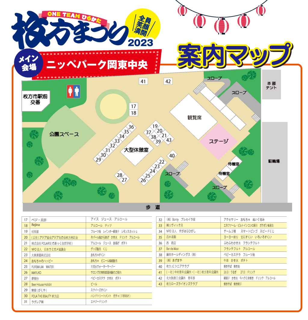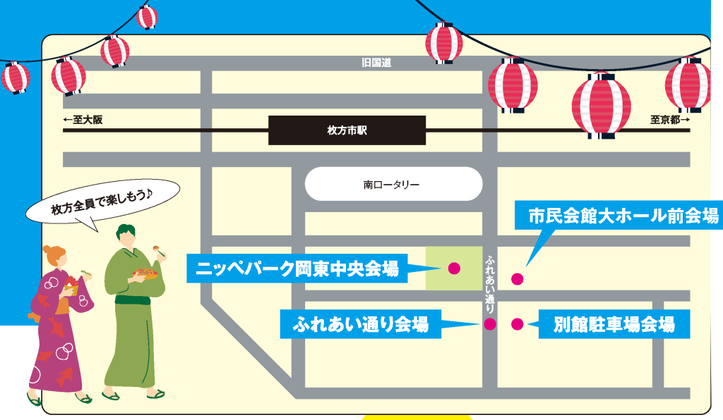 枚方まつり2023は「ニッペパーク岡東中央」「市民会館大ホール前会場」「ふれあい通り会場」「別館駐車場会場」の4つで開催されます。