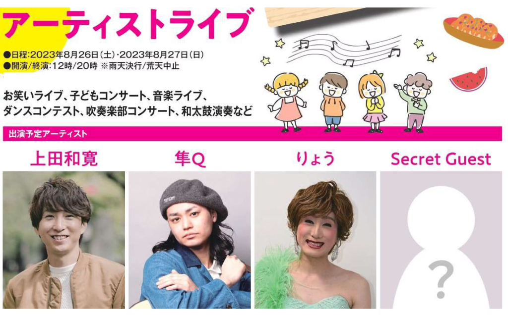 アーティストライブには元TANEBIの上田和寛さん、大東出身のミュージシャン・隼Qさん、小林幸子さんのモノマネでおなじみのりょうさんの3人。