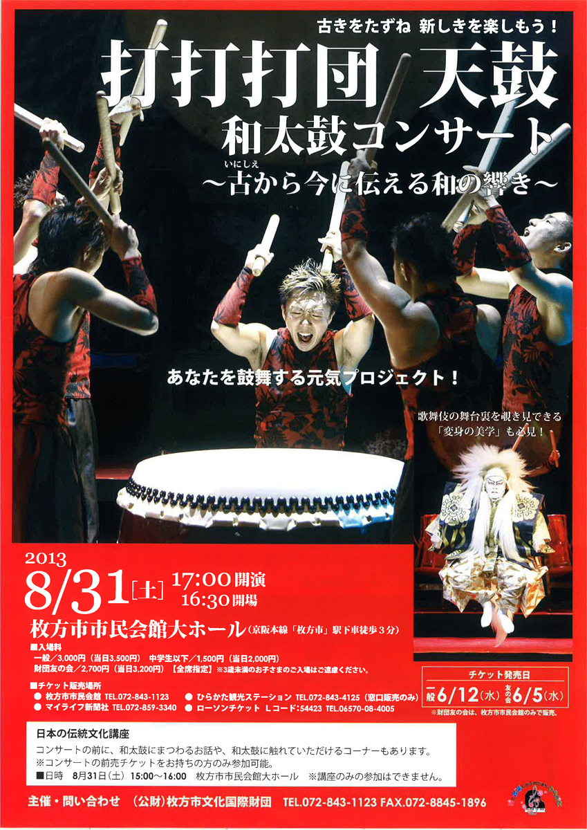 平成25年8月31日(土)に、枚方市市民会館大ホールで開催される「打打打団 天鼓 和太鼓コンサート~古(いにしえ)から今に伝える和の響き~」に、5組10名様を招待していただけることになりました!![]()