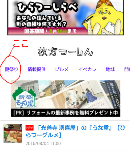 夏祭りスケジュールをご覧の際は、上記画像でいうと「ここ」と赤丸で囲んだ場所をクリックしていただけると楽です!