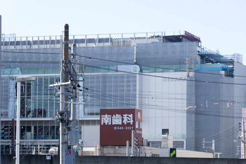 「枚方市駅前に建設中の「枚方T-SITE」の北側が片鱗を覗かせてる。「HIRAKATA」の文字も」より。
