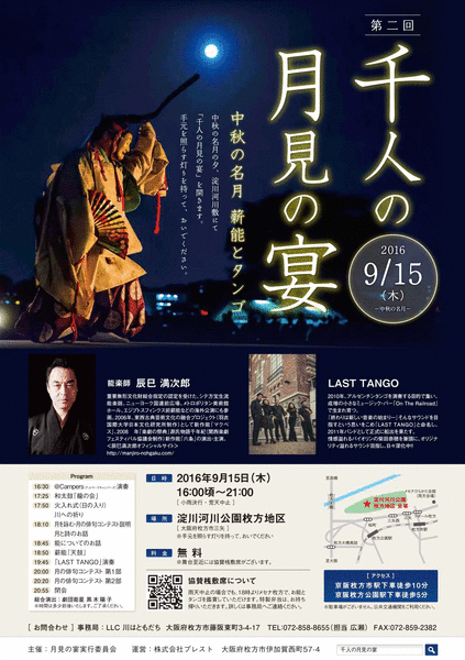 千人の月見の宴は、淀川河川公園 枚方地区にて中秋の名月の日に行われ、今年で2回目を迎えます。お月見をしながら「薪能とタンゴ」を楽しむという粋なイベントで入場は無料!