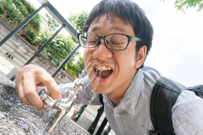 (真夏の公園で水分補給をするクロ@ひらつー)