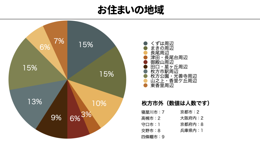 みんな結構ばらけてて、くずは周辺、まきの周辺、枚方公園・光善寺周辺あたりがだいたい同じになったわ〜。