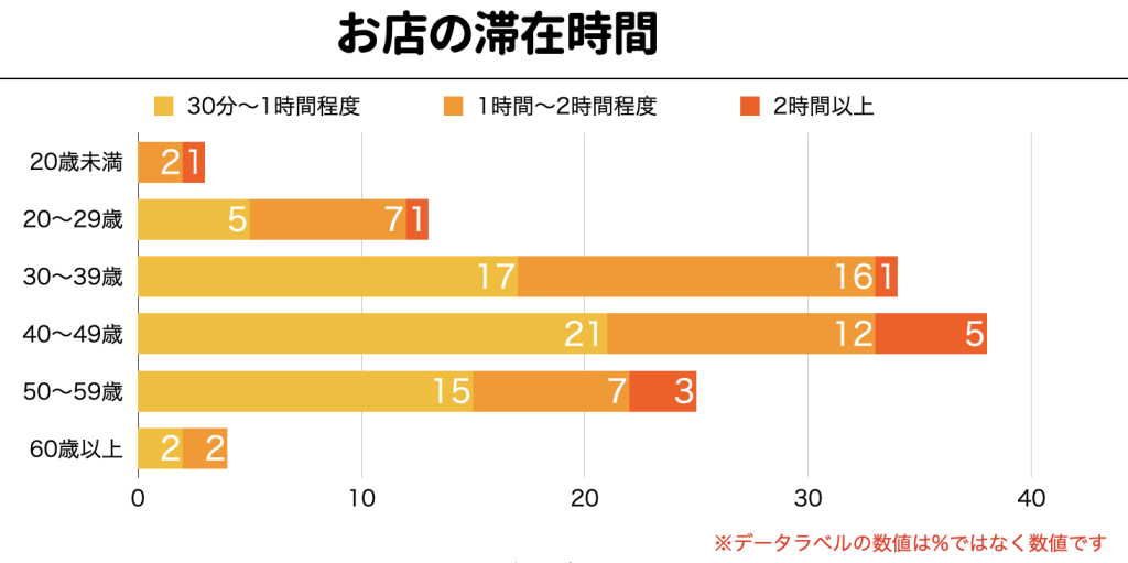 次はどれくらいお店で過ごしてる?って質問やねんけど、30分〜1時間程度の人が多いみたいやな。