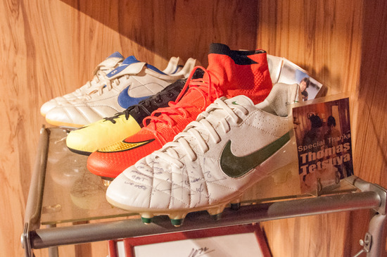スポーツ!!!(店内にある大画面テレビ2台でスポーツ観戦ができる他、店内にはサッカーのスパイクやユニフォームも飾られています)