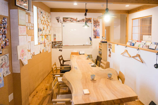 打ち合わせスペースには大きな一枚板のテーブルが置かれています。