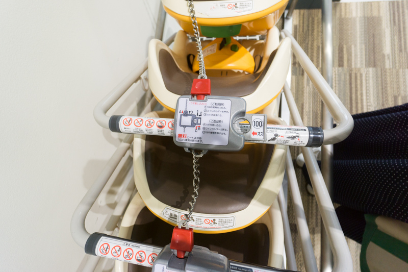 そして使い終わったら元の置き場に持っていき、チェーンを挿すと100円が戻って来るシステム。